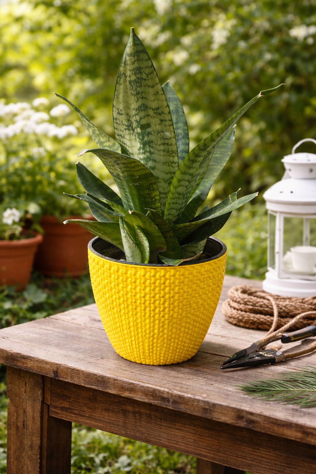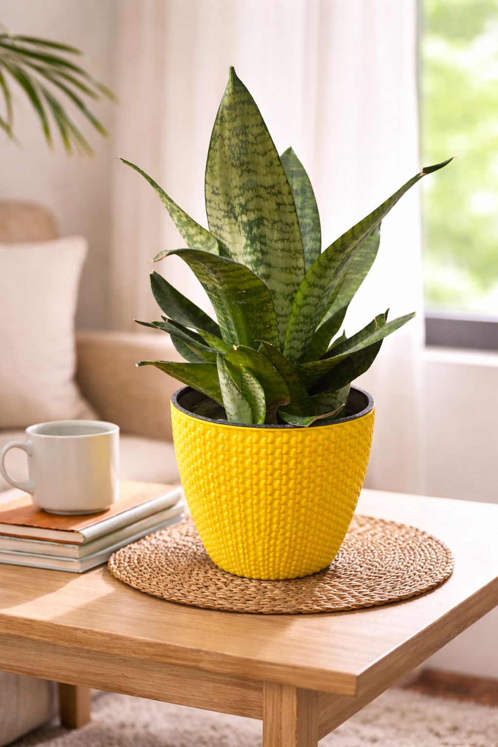 Live snake plant in a bright yellow double-layered textured plastic pot.