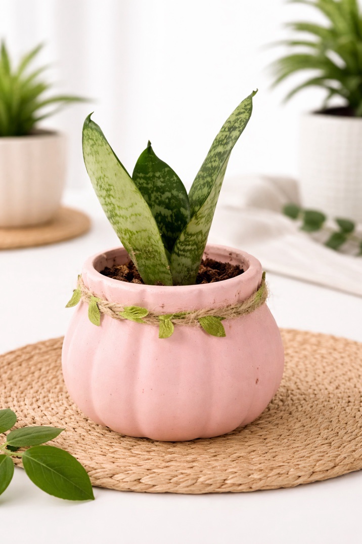 The snake plant is known for its air-purifying qualities and low-maintenance nature, making it perfect for homes, offices, study tables, or as a thoughtful gift. The elegant pastel pot with a charming leaf-detail twine adds a warm, aesthetic appeal to any décor.
