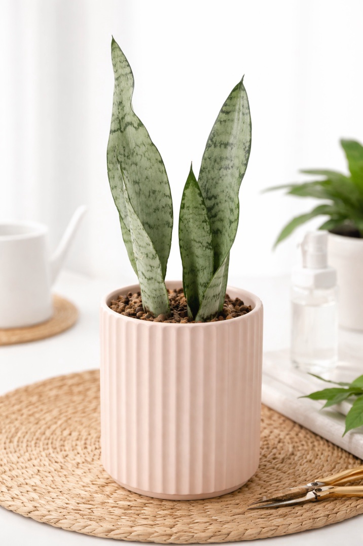 Bring home effortless elegance with the Moonshine Snake Plant, beautifully paired with a premium blush ribbed ceramic pot. Known for its silvery-green upright leaves and modern appeal, this low-maintenance indoor plant is perfect for homes, offices, and gifting.